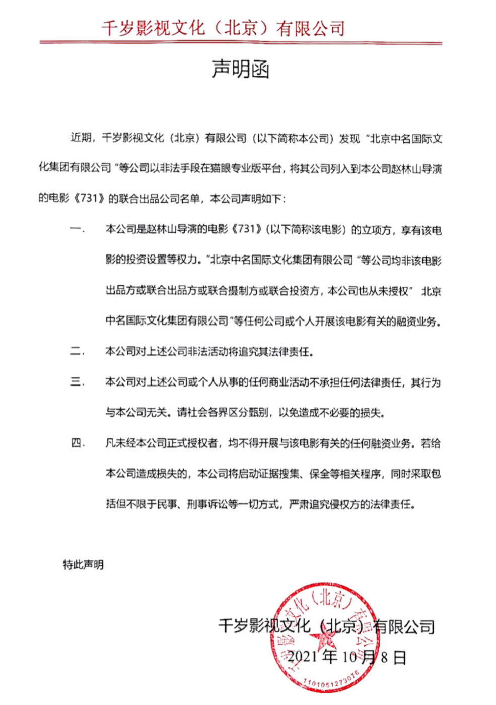 这些和核心出品方没关系,纯粹是下面公司的行为,这才会屡次出现有电影公司出声明,提醒投资者谨防投资诈骗的原因,就连这段时间备受关注的《731》也出过类似的声明。