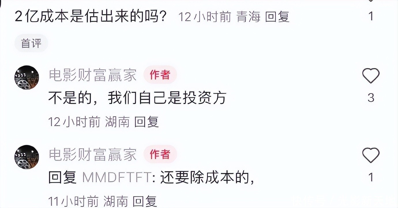 退一步说,声称自己是投资方的网友,很可能是从二级市场买的份额,本身就有很高的溢价,这也是当下电影圈很常见的行为。简单举例,一部电影实际制作成本1亿,第一轮募资,主控方就已经将所有的制作费都拿到了,接着这些参与投资的出品方会将手上的份额“稀释”后再卖出去,本来投资1000万,可能会溢价到2000万再对外销售,这时电影对外宣称的制作成本就已经变成2亿了。