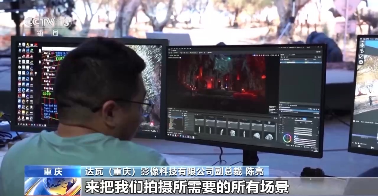 达瓦(重庆)影像科技有限公司副总裁 陈亮:通过数字制景、数字资产制作师这样的岗位来把我们拍摄所需要的场景通过数字化三维模型给建出来,之后懂LED新型设备的工程师在现场对设备进行调适。第二个是虚拟拍摄系统工程师,会对现场的导演需求进行响应,并且确保系统的平稳。