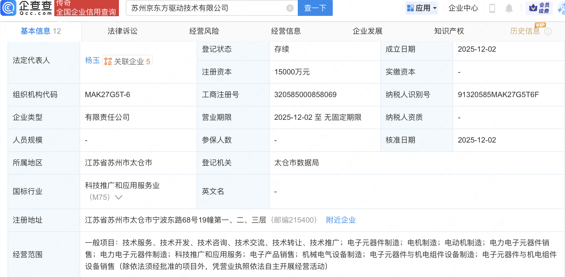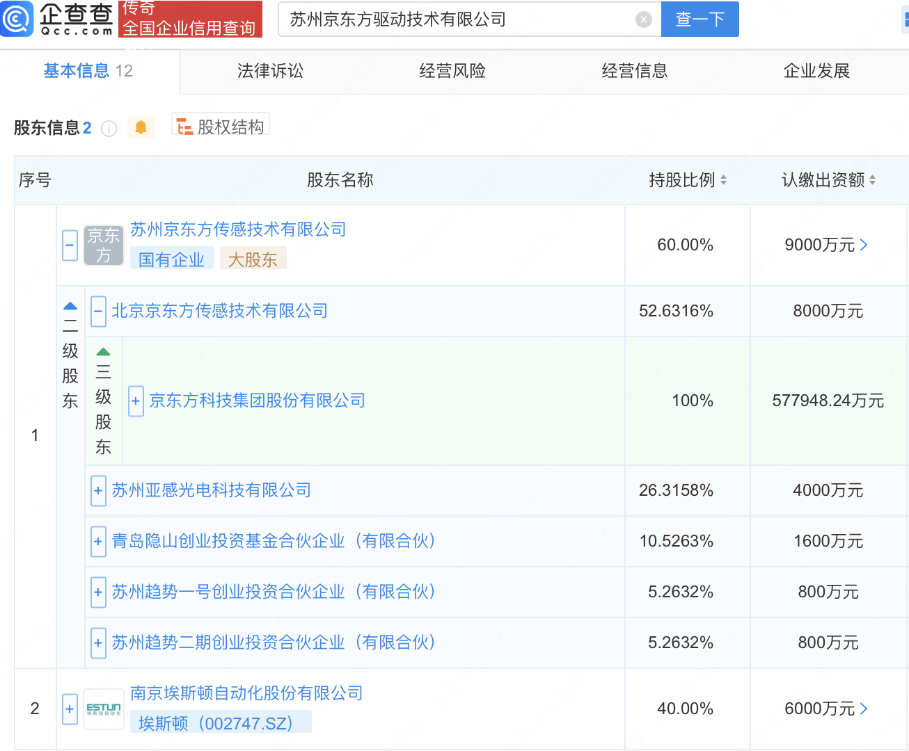 近日,苏州京东方驱动技术有限公司成立炒股配资咨询投资,注册资本1.5亿元,经营范围包含:电子元器件制造;电机制造;电动机制造;电力电子元器件销售等。企查查股权穿透显示,该公司由京东方A(000725)旗下苏州京东方传感技术有限公司、埃斯顿(002747)共同持股。